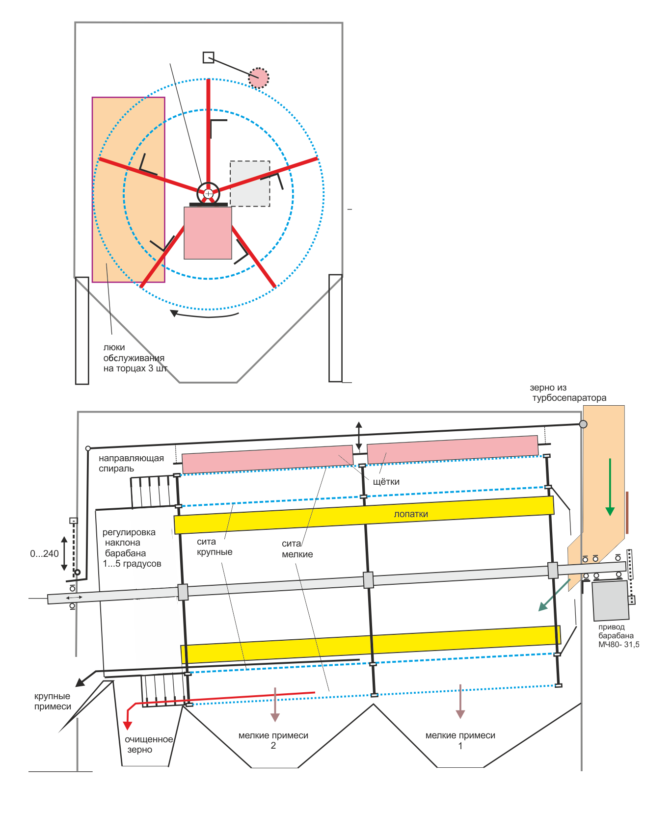 Метод сепарації, який використовується при очищенні зерна барабанним сепаратором заснований на аеродинамічному і геометричному принципах. Система роботи машини побудована таким чином, що вихідне зерно, що потрапляє в пневмосепаратуючих канал повітряного сепаратора, продувається поперечним потоком повітря, створюваним відцентровим вентилятором, яка відділяє легені домішки. Кількість дрібних домішок, що йдуть з потоком повітря, регулюється шляхом зміни потужності аспірації. Більш важкі частки випадають з потоку повітря і потрапляють в подвійній ситової барабан «матрьошку», де зерно очищається від домішок, що відрізняються за розмірами. Великий сміття виходить в кінці внутрішнього барабана, а зерно потрапляє крізь решето на сита другого барабана. У ньому колоті зерна і дрібні домішки через сита потрапляють в бункера для дрібних домішок, а очищене зерно зливається з барабана в бункер готового продукту. Вибір комбінацій сит різної перфорації на різних робочих секціях робить цю машину універсальної і дозволяє забезпечувати різні схеми очищення, наприклад з виділенням очищеного зерна і дрібних домішок двох розмірів, розділяючи при цьому насіння бур'янів і Дробленка.