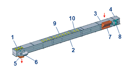 Транспортёр состоит из приводной станции 1, проходных секций 2, загрузочной секции 3 и натяжной секции 4. Приводная станция содержит разгрузочную воронку 5 и приводной мотор-редуктор 6; загрузочная секция содержит одну или две боковые загрузочные воронки 7; натяжение цепи обеспечивается винтами 8. Цепь 9 снабжена погружными пластмассовыми скребками. Стенки проходных секций имеют продольные направляющие 10, обеспечивающие надёжное позиционирования цепи. Возможно горизонтальное исполнение с одним наклонным участком, установка нескольких разгрузочных шиберов и т.д.