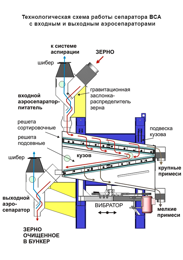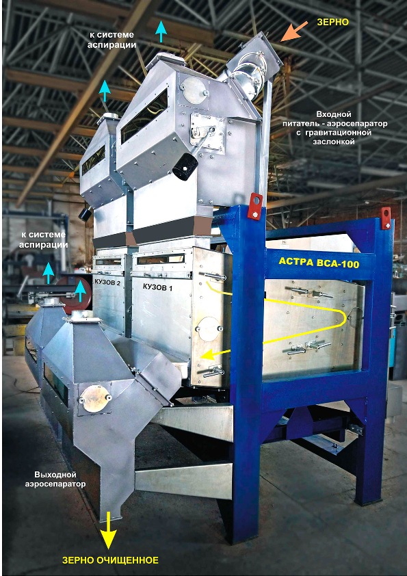 двухконтурная воздушная очистка зерна – на входе и выходе сепаратора (само аспирационное оборудование в комплект сепаратора не входит и заказывается отдельно).