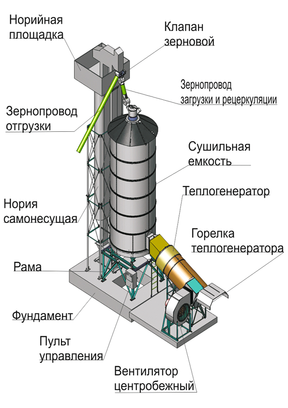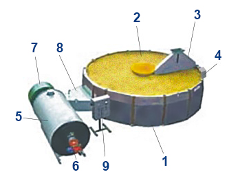 Сушилка состоит из корпуса 1, внутри которого установлена решётчатая «карусельная» платформа. Пространство над платформой заполняется зерном 2. Зерно подаётся самотёком в бункер – распределитель 3 и отгружается скребковым транспортёром 4. Горячий воздух подаётся под решётчатую платформу от теплогенератора 5 с моноблочной горелкой 6 (дизтопливо, газ) с помощью вентилятора 7 через патрубок 8.