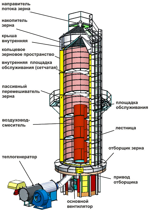 - прогревание зерна верхнего, нового слоя происходит почти остывшим воздухом, его нагрев происходит по мере опускании вниз, вследствие уборки скребковым транспортером самого нижнего слоя, нагретого до установленной нормативами температуры и готового к выгрузке;