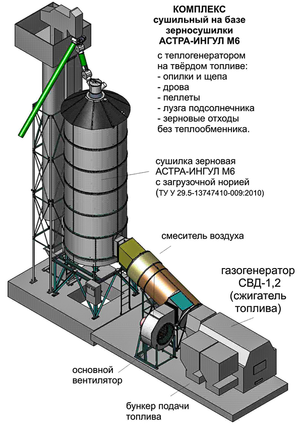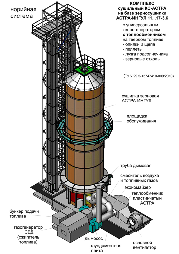 Безусловно, неизменным остается принцип действия башенной зерносушилки, основанный на сушке зерна, движущегося между двумя перфорированными листами, продуваемыми горячим воздухом. Зерносушилка «АСТРА-ИНГУЛ» имеет форму цилиндра, внутрь которого подается горячий воздух от расположенного вне сушилки теплогенератора с моноблочной горелкой. Последнее дает ряд преимуществ по использованию сушилки.