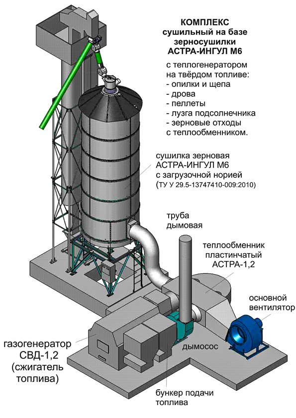 Комплекс из двух порционных зерносушилок "АСТРА-ИНГУЛ-М6" с одним общим, непрерывно работающим и попеременно переключающимся с одной сушилки на другую теплогенератором (пока в одной сушилке идет нагрев зерна, - в другой происходит охлаждение, выгрузка и загрузка новой порции) обеспечивает при 5% съеме влаги производительность до 220 т/сутки, а при съеме влаги 10% до 180 т/сутки. В теплогенераторе используются блочные горелки на дизтопливе или газе.