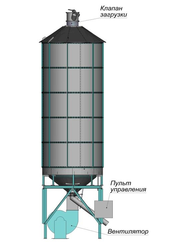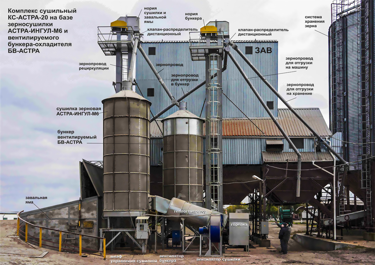 Вентилируемые бункера АСТРА-БВ с сушилками циклического действия АСТРА-ИНГУЛ-М играют роль охладителей зерна. Бункер стоит в технологической цепочке следом за сушилкой. Зерно в сушилке подогревается до заданной температуры.